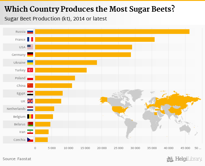 Based on a comparison of 53 countries in 2014, Russia ranked the highest in sugar beet production with 46,350 kt followed by France and USA. On the other end of the scale was Mexico with 0.735 kt, Lebanon with 2.14 kt and Ecuador with 4.20 kt.