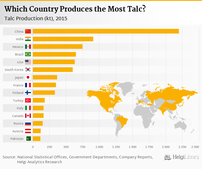 Based on a comparison of 35 countries in 2015, China ranked the highest in talc production with 2,200 kt followed by India and Mexico. On the other end of the scale was Colombia with 0.100 kt, Taiwan with 0.162 kt and Uruguay with 0.590 kt.