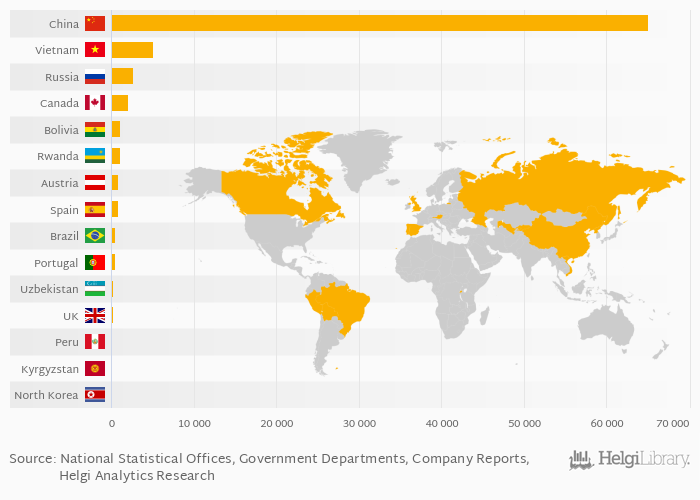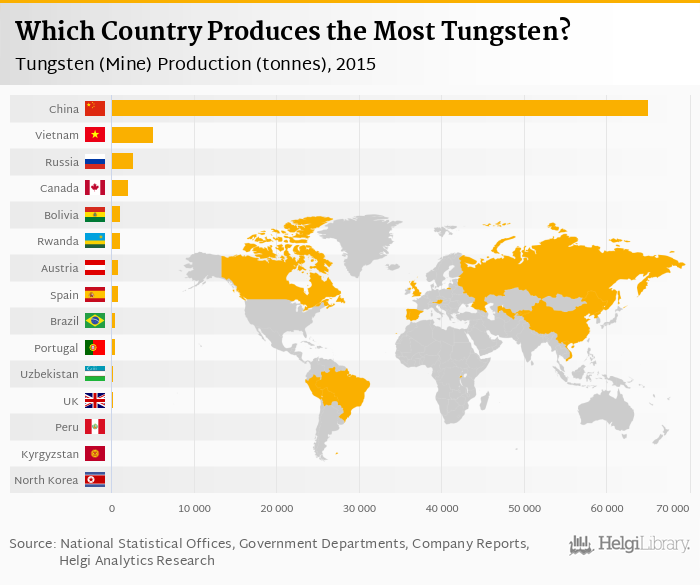 Based on a comparison of 20 countries in 2015, China ranked the highest in tungsten (mine) production with 65,000 tonnes followed by Vietnam and Russia. On the other end of the scale was Burundi with 12.0 tonnes, Australia with 25.0 tonnes and Uganda with 28.0 tonnes.