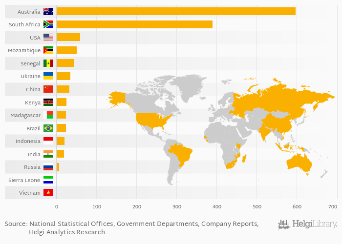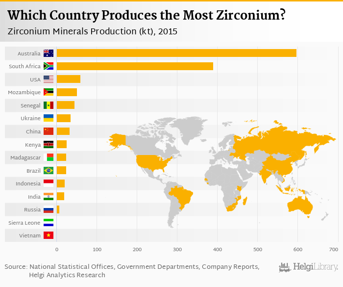 Based on a comparison of 17 countries in 2015, Australia ranked the highest in zirconium minerals production with 598 kt followed by South Africa and USA. On the other end of the scale was Sri Lanka with 0.614 kt, Malaysia with 0.826 kt and Vietnam with 1.00 kt.