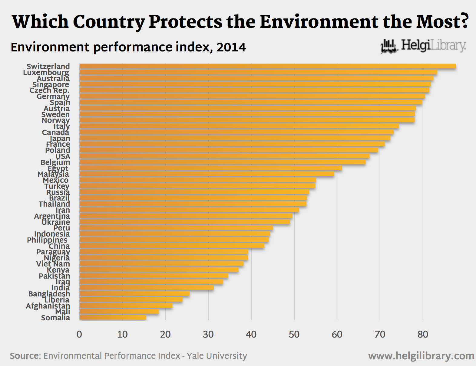 Protecting the environment is a theme that runs through many of the new Global Goals for Sustainable Development. The Environmental Performance Index (EPI) ranks how well countries perform on high-priority environmental issues in two broad policy areas: protection of human health from environmental harm and protection of eco-systems.