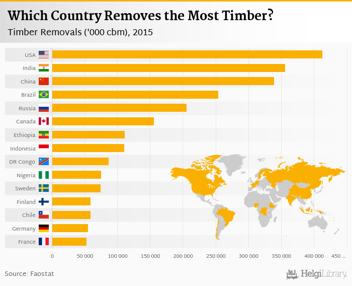 Based on a comparison of 172 countries in 2015, USA ranked the highest in timber removals with 412,917 '000 cbm followed by India and China. On the other end of the scale was Mauritius with 2.00 '000 cbm, Iceland with 3.64 '000 cbm and Qatar with 5.12 '000 cbm.