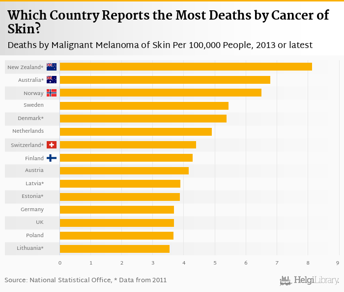 Based on a comparison of 36 countries in 2013, New Zealand ranked the highest in deaths by malignant melanoma of skin per 100,000 people with 8.14 followed by Australia and Norway. On the other end of the scale was Mexico with 0.454, Japan with 0.477 and Colombia with 0.483.