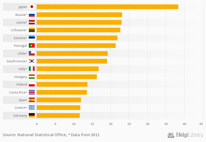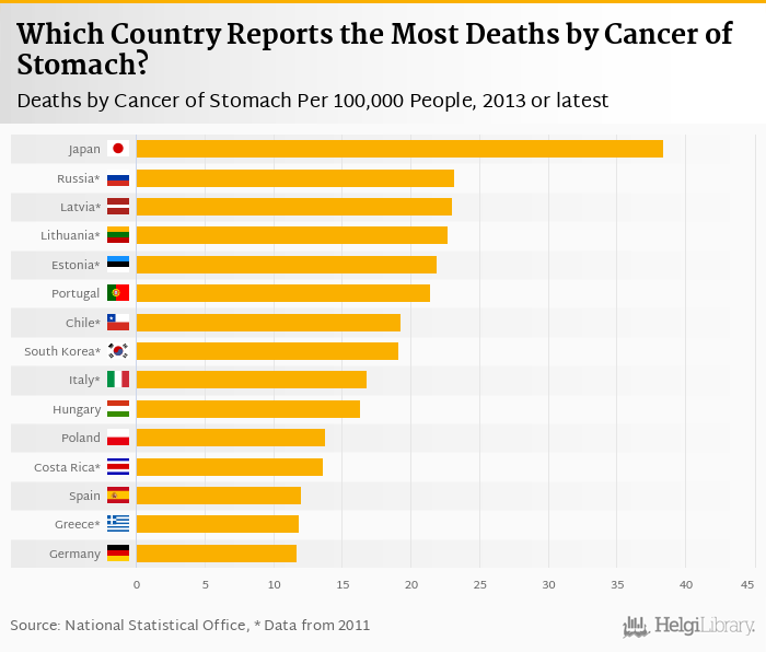 Based on a comparison of 36 countries in 2013, Japan ranked the highest in deaths by cancer of stomach per 100,000 people with 38.4 followed by Russia and Latvia. On the other end of the scale was South Africa with 2.21, Mexico with 4.53 and Australia with 5.02.