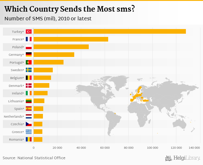 Based on a comparison of 30 countries in 2010, Turkey ranked the highest in number of sms with 128,220 mil followed by France and Poland. On the other end of the scale was Iceland with 147 mil, Estonia with 218 mil and Luxembourg with 439 mil.