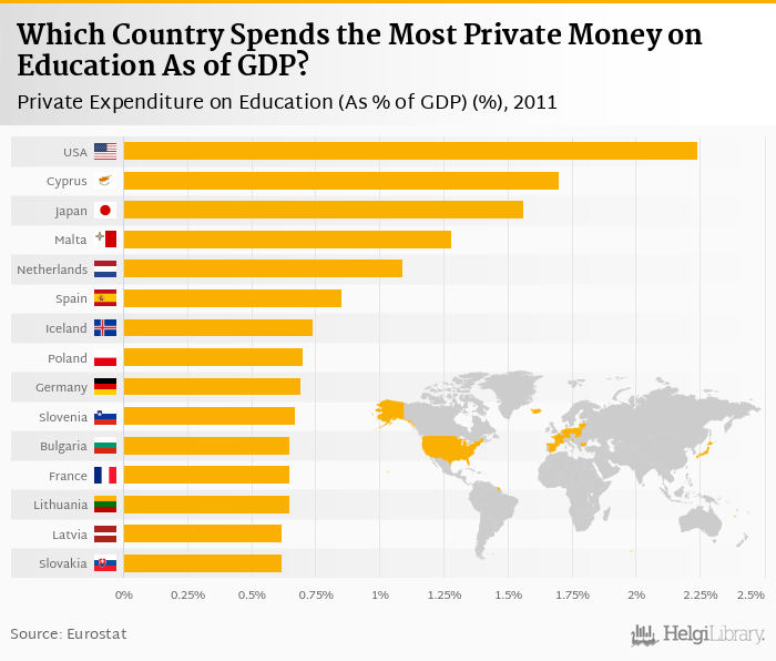 Based on a comparison of 30 countries in 2011, USA ranked the highest in private expenditure on education as a share of GDP with 2.24% followed by Cyprus and Japan. On the other end of the scale was Norway with 0.100%, Romania with 0.110% and Finland with 0.150%.