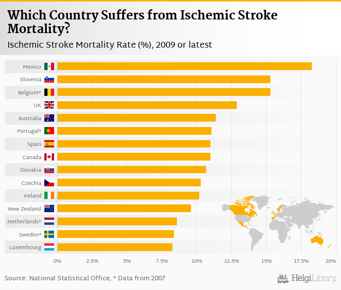 Based on a comparison of 28 countries in 2009, Mexico ranked the highest in ischemic stroke mortality rate with 18.3% followed by Slovenia and Belgium. On the other end of the scale was South Korea with 2.50%, Japan with 3.40% and USA with 4.20%.