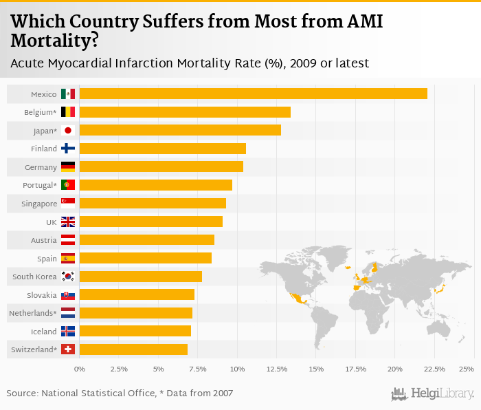 Based on a comparison of 29 countries in 2009, Mexico ranked the highest in acute myocardial infarction mortality rate with 22.1% followed by Belgium and Japan. On the other end of the scale was Denmark with 3.90%, Poland with 4.80% and Luxembourg with 5.00%.