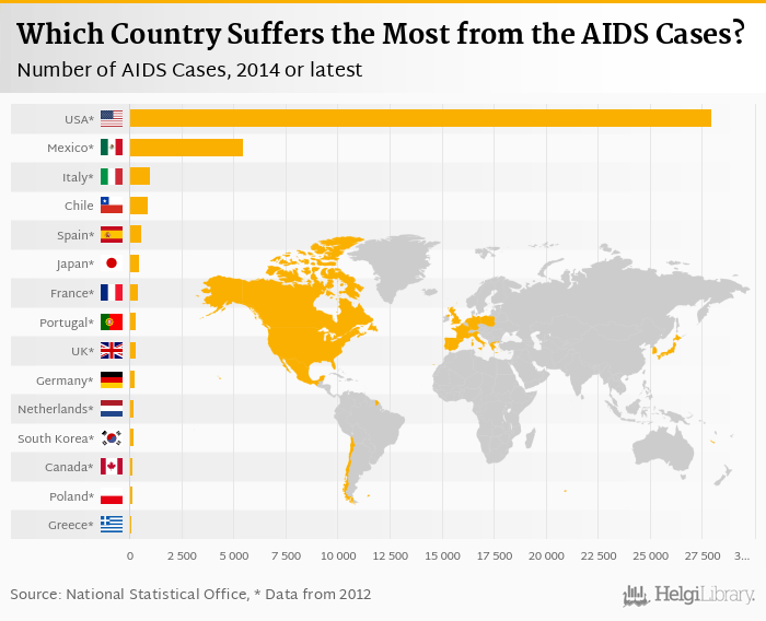 Based on a comparison of 33 countries in 2014, USA ranked the highest in number of aids cases with 27,928 followed by Mexico and Italy. On the other end of the scale was Iceland with 1.00, Slovakia with 6.00 and New Zealand with 7.00.