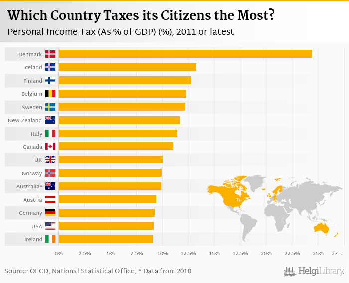 Based on a comparison of 32 countries in 2011, Denmark ranked the highest in personal income tax as a share of GDP with 24.5% followed by Iceland and Finland. On the other end of the scale was Slovakia with 2.52%, Czech Republic with 3.70% and Turkey with 3.77%.