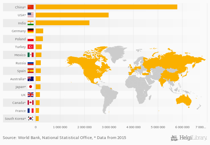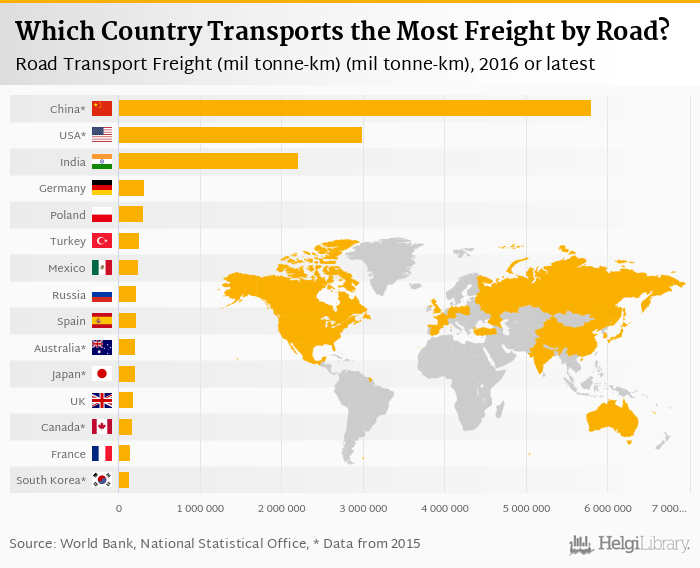 Based on a comparison of 46 countries in 2016, China ranked the highest in road transport freight measured by mil tonne-km with 5,795,570 mil tonne-km followed by USA and India. On the other end of the scale was Montenegro with 121 mil tonne-km, Armenia with 479 mil tonne-km and Georgia with 674 mil tonne-km.