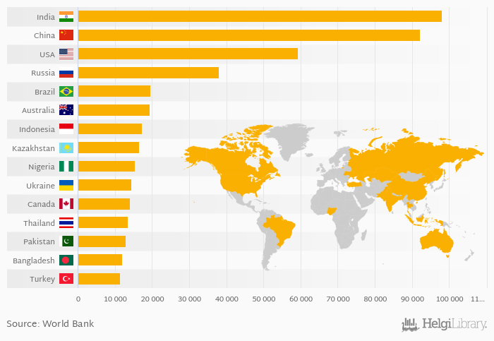 The top ranked country, India, accounted for 13.9 % of land under cereal production in the world. The top 3 countries hold a 35.4 % share while the ten largest countries some 55.3 % in 2014.
