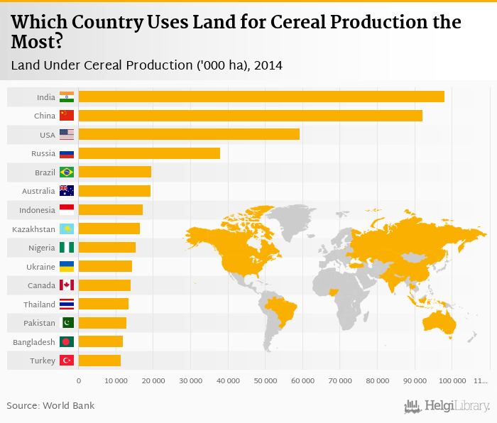 Based on a comparison of 167 countries in 2014, India ranked the highest in land under cereal production with 97,971 '000 ha followed by China and USA. On the other end of the scale was Djibouti with 0.008 '000 ha, Maldives with 0.069 '000 ha and Bahamas with 0.094 '000 ha.
