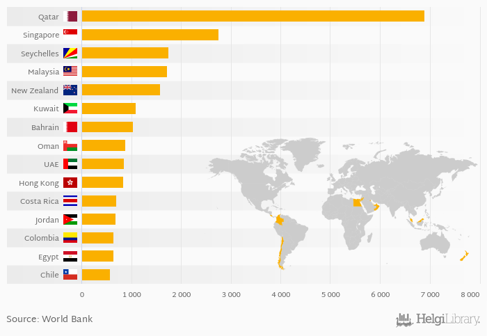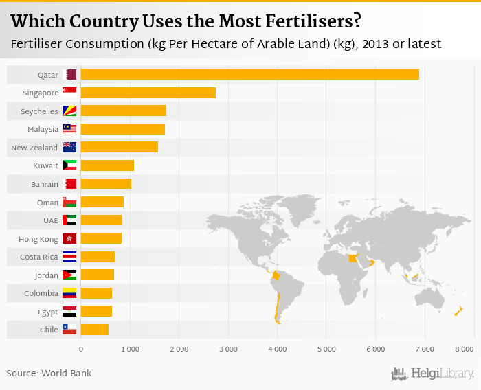Based on a comparison of 152 countries in 2013, Qatar ranked the highest in fertiliser consumption with 6,899 kg followed by Singapore and Seychelles. On the other end of the scale was Gambia with 0.493 kg, Niger with 0.668 kg and Eritrea with 0.770 kg.