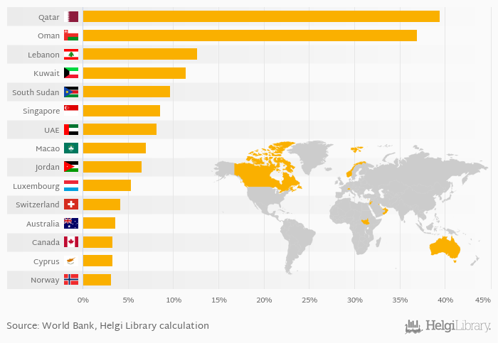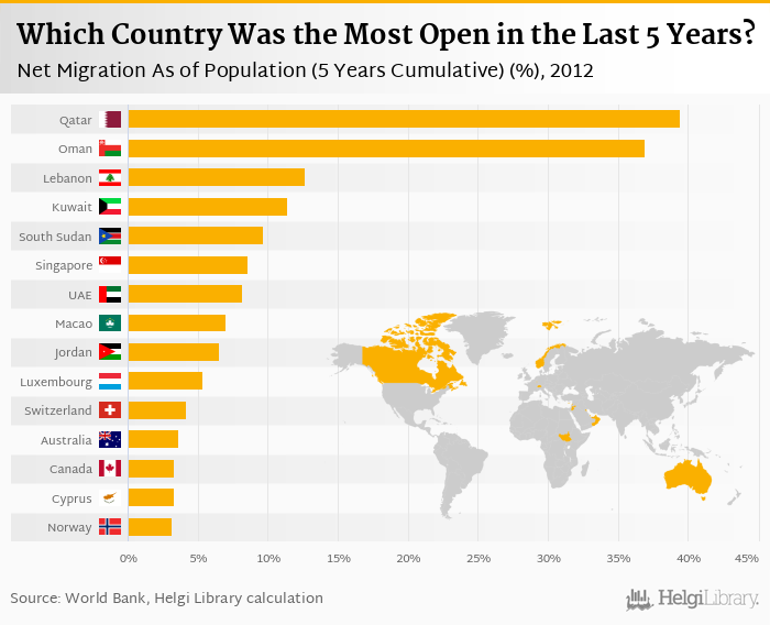 Based on a comparison of 174 countries in 2012, Qatar ranked the highest in five years cumulative net migration as a percentage of population with 39.4% followed by Oman and Lebanon. On the other end of the scale was Syria with -7.32%, East Timor with -7.21% and Guyana with -4.24%.