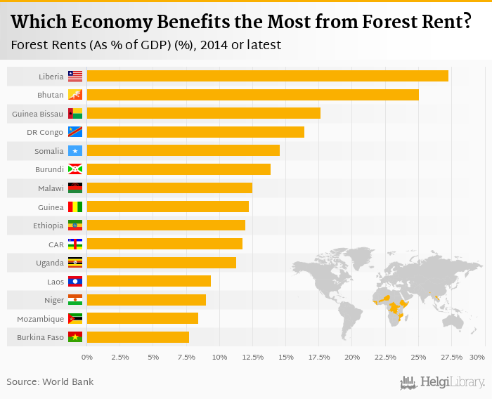 Based on a comparison of 169 countries in 2014, Liberia ranked the highest in forest rents as a percentage of GDP with 27.3% followed by Bhutan and Guinea Bissau. On the other end of the scale was Qatar with < 0.001%, United Arab Emirates with < 0.001% and Israel with < 0.001%.