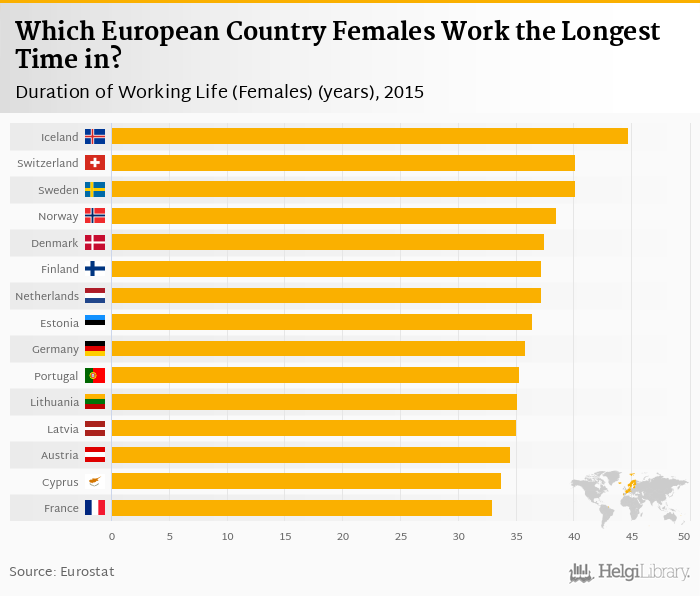 Based on a comparison of 31 countries in 2015, Iceland ranked the highest in Duration of Working Life (Females) with 44.7 years followed by Switzerland and Sweden. On the other end of the scale was Turkey with 17.2 years, Macedonia with 25.1 years and Italy with 25.7 years.