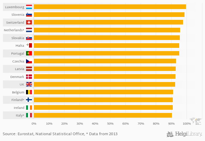 | Luxembourg | % | ... | ... | ... | ... | ... | ... | ... | ... | ... | 97.9% | 98.0% | 97.4% | 98.4% | 99.6% | |||||||