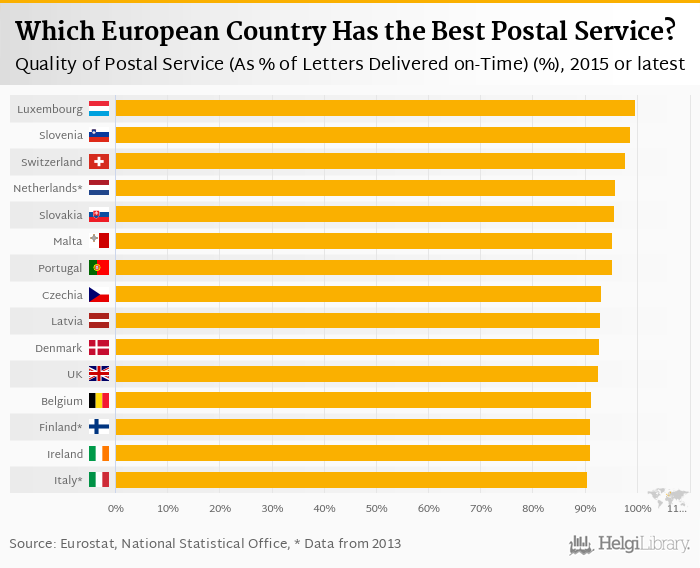 Based on a comparison of 30 countries in 2015, Luxembourg ranked the highest in quality of postal service in terms of letters delivered on-time with 99.6% followed by Slovenia and Switzerland. On the other end of the scale was Romania with 23.4%, Poland with 60.9% and Serbia with 71.1%.