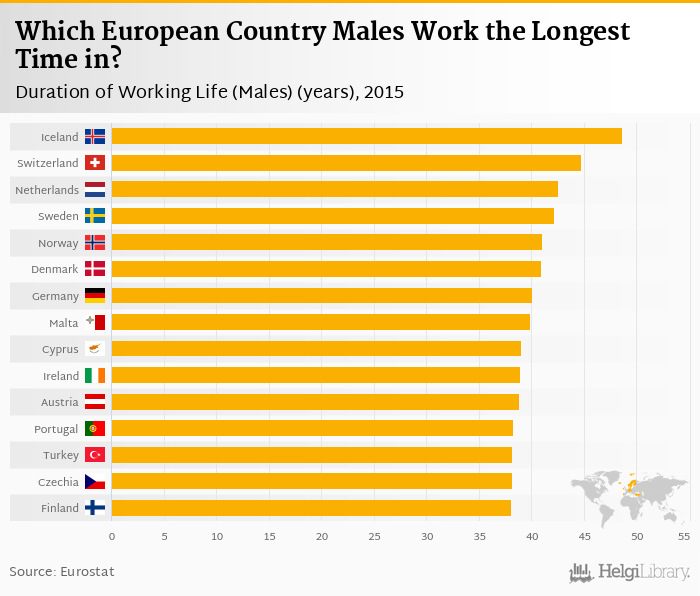 Based on a comparison of 31 countries in 2015, Iceland ranked the highest in Duration of Working Life (Males) with 48.6 years followed by Switzerland and Netherlands. On the other end of the scale was Bulgaria with 33.4 years, Croatia with 34.5 years and Lithuania with 34.5 years.