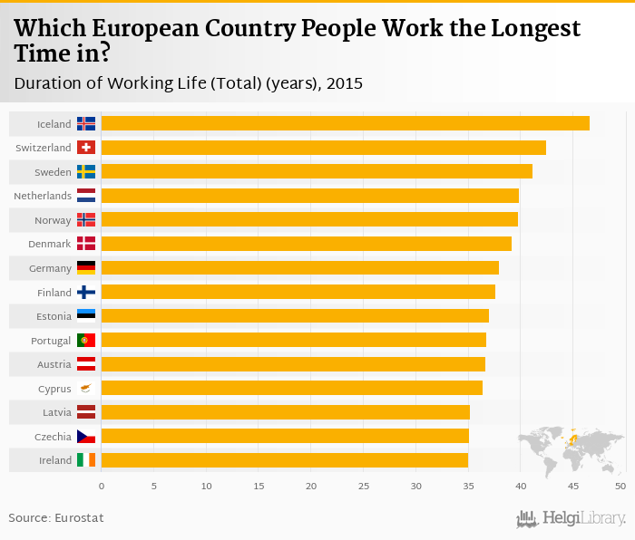 Based on a comparison of 31 countries in 2015, Iceland ranked the highest in Duration of Working Life (Total) with 46.6 years followed by Switzerland and Sweden. On the other end of the scale was Turkey with 28.0 years, Italy with 30.7 years and Macedonia with 31.2 years.