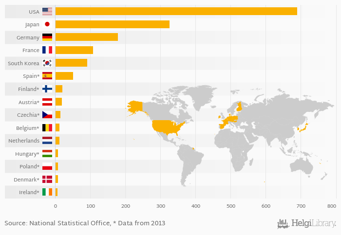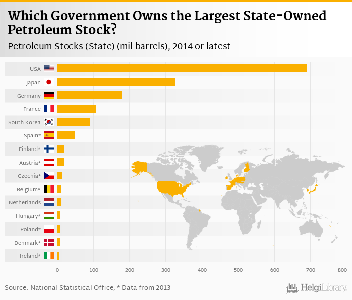 Based on a comparison of 19 countries in 2014, USA ranked the highest in state petroleum stocks with 691 mil barrels followed by Japan and Germany. On the other end of the scale was Estonia with 0.686 mil barrels, Slovenia with 3.54 mil barrels and Slovakia with 5.40 mil barrels.