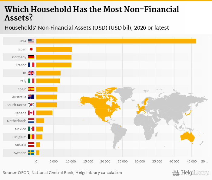 Based on a comparison of 25 countries in 2020, USA ranked the highest in households' non-financial assets with USD 46,301 bil followed by Japan and Germany. On the other end of the scale was Estonia with USD 40.9 bil, Lithuania with USD 68.1 bil and Slovenia with USD 98.5 bil.