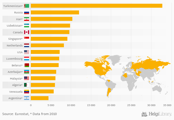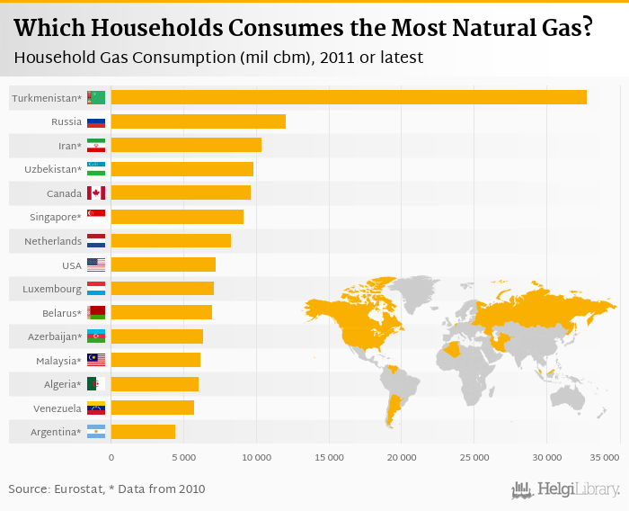 Based on a comparison of 75 countries in 2011, Turkmenistan ranked the highest in household gas consumption with 32,743 mil cbm followed by Russia and Iran. On the other end of the scale was Ghana with 27.4 mil cbm, Albania with 50.6 mil cbm and Morocco with 109 mil cbm.