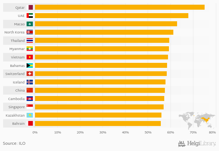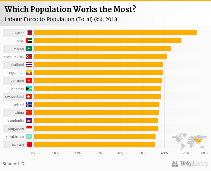 Based on a comparison of 172 countries in 2013, Qatar ranked the highest in Labour Force to Population (Total) with 75.2% followed by United Arab Emirates and Macao. On the other end of the scale was East Timor with 21.5%, Palestine with 23.9% and Jordan with 24.5%.