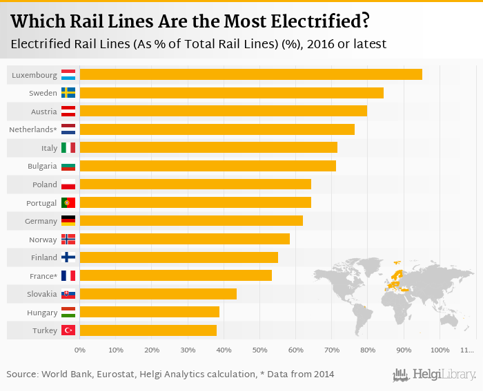 Based on a comparison of 25 countries in 2016, Luxembourg ranked the highest in electrified rail lines as a share of total rail lines with 95.3% followed by Sweden and Austria. On the other end of the scale was Lithuania with 6.38%, Ireland with 6.83% and Estonia with 10.7%.