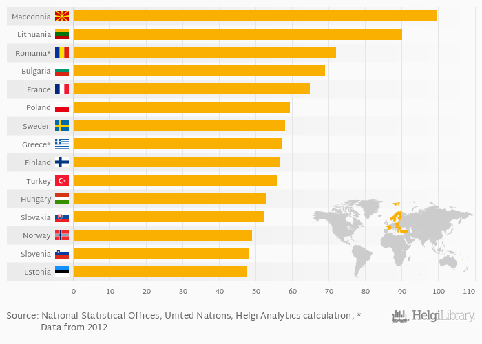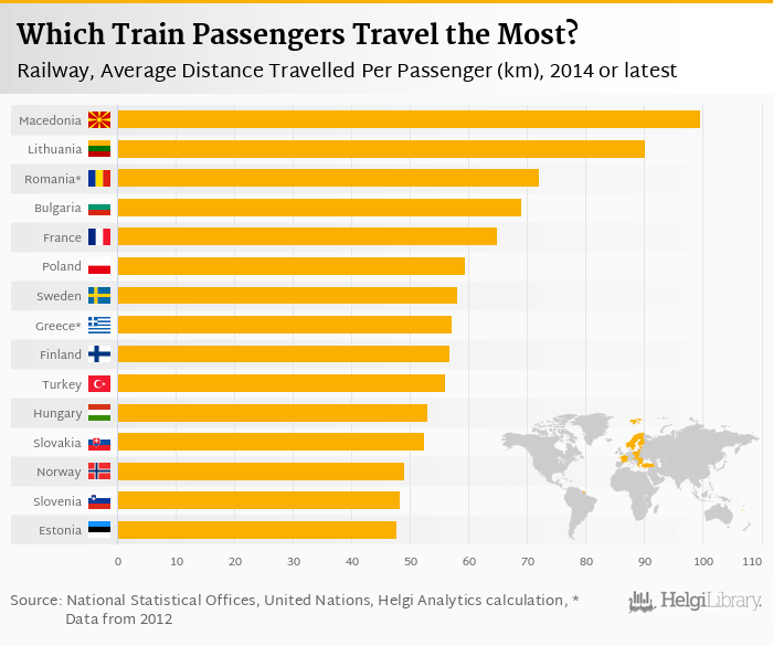 Based on a comparison of 28 countries in 2014, Macedonia ranked the highest in railway, average distance travelled per passenger with 99.6 km followed by Lithuania and Romania. On the other end of the scale was Luxembourg with 18.7 km, Portugal with 30.0 km and Germany with 31.3 km.