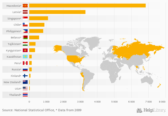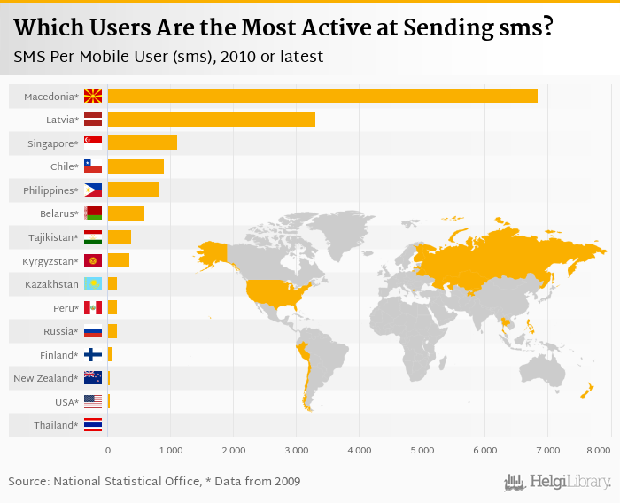 Based on a comparison of 15 countries in 2010, Macedonia ranked the highest in sms per mobile user with 6,845 sms followed by Latvia and Singapore. On the other end of the scale was Thailand with 2.22 sms, USA with 43.4 sms and New Zealand with 46.3 sms.