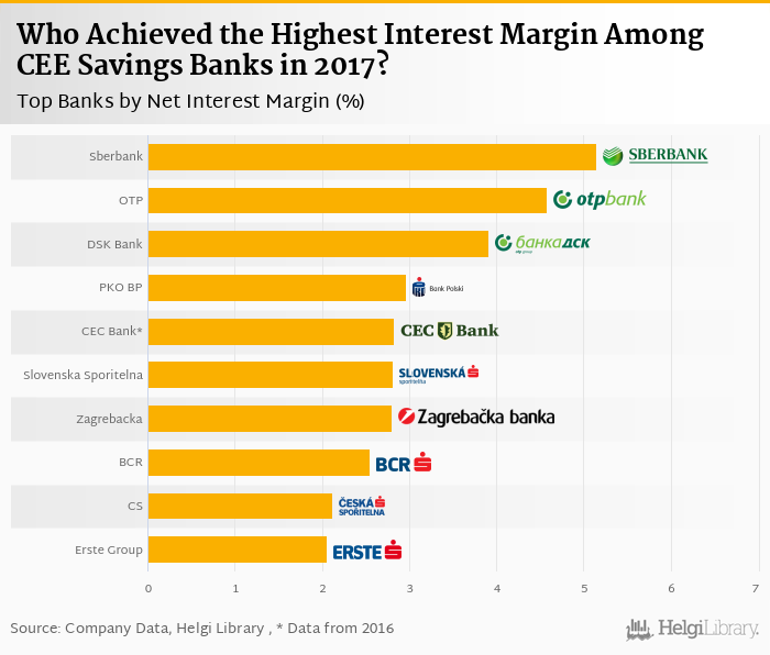Based on a comparison of 10 banks among CEE Savings Banks in 2017, Sberbank operated with the highest net interest margin, followed by OTP Group and DSK Bank.