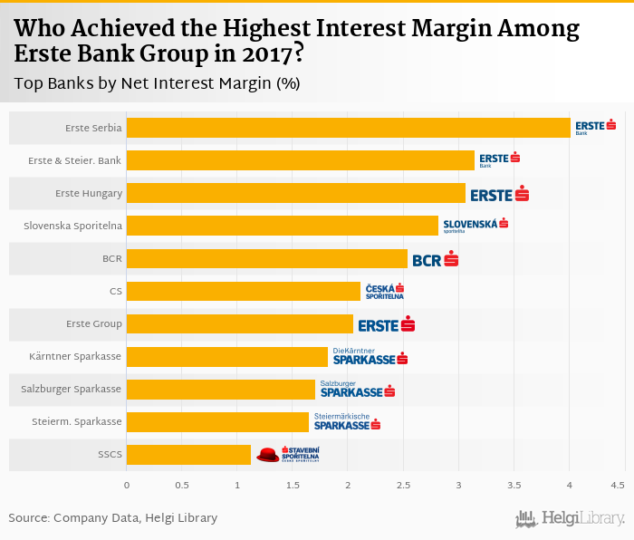 Based on a comparison of 12 banks among Erste Bank Group in 2017, Erste Bank Serbia operated with the highest net interest margin, followed by Erste & Steiermarkische Bank and Erste Bank Hungary.