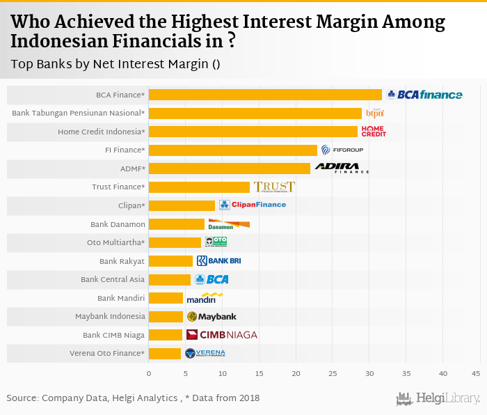 Comparing BCA Finance with its closest peers, Bank Tabungan Pensiunan Nasional operated in 2019 with a net interest margin of 29.1% Home Credit Indonesia reached 28.5% and Federal International Finance some 23.0%.