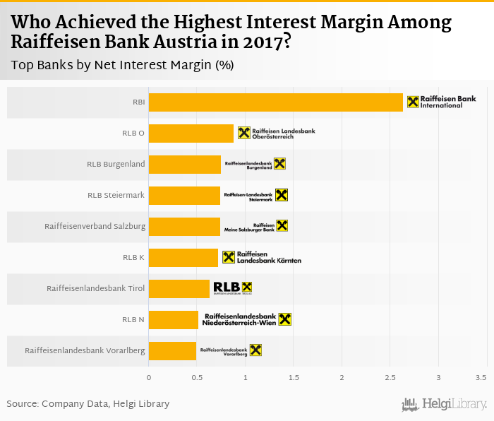 Based on a comparison of 9 banks among Raiffeisen Bank Austria in 2017, Raiffeisen Bank Int. operated with the highest net interest margin, followed by Raiffeisenlandesbank Oberosterreich and Raiffeisenlandesbank Burgenland.