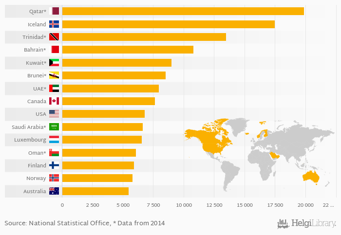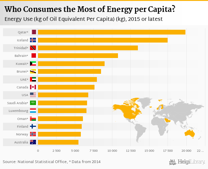 Based on a comparison of 140 countries in 2015, Qatar ranked the highest in energy use in terms of kg of oil equivalent per capita with 19,903 kg followed by Iceland and Trinidad and Tobago. On the other end of the scale was South Sudan with 62.4 kg, Niger with 149 kg and Bangladesh with 227 kg.