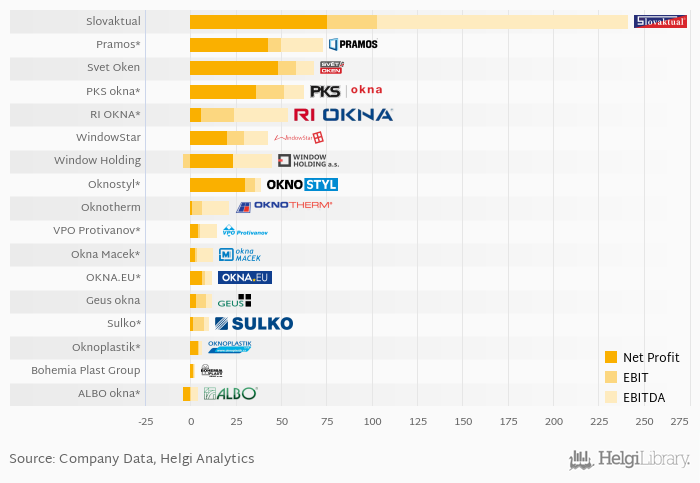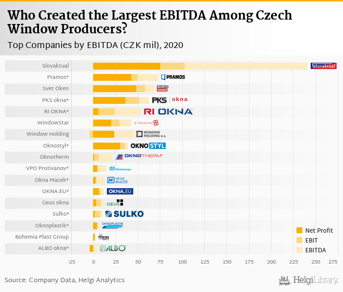 Based on a comparison of 17 firms among Czech Window Producers, Slovaktual generated the highest earnings before interest cost, taxes and depreciation (so called EBITDA) in 2020 followed by Pramos and Svet Oken.