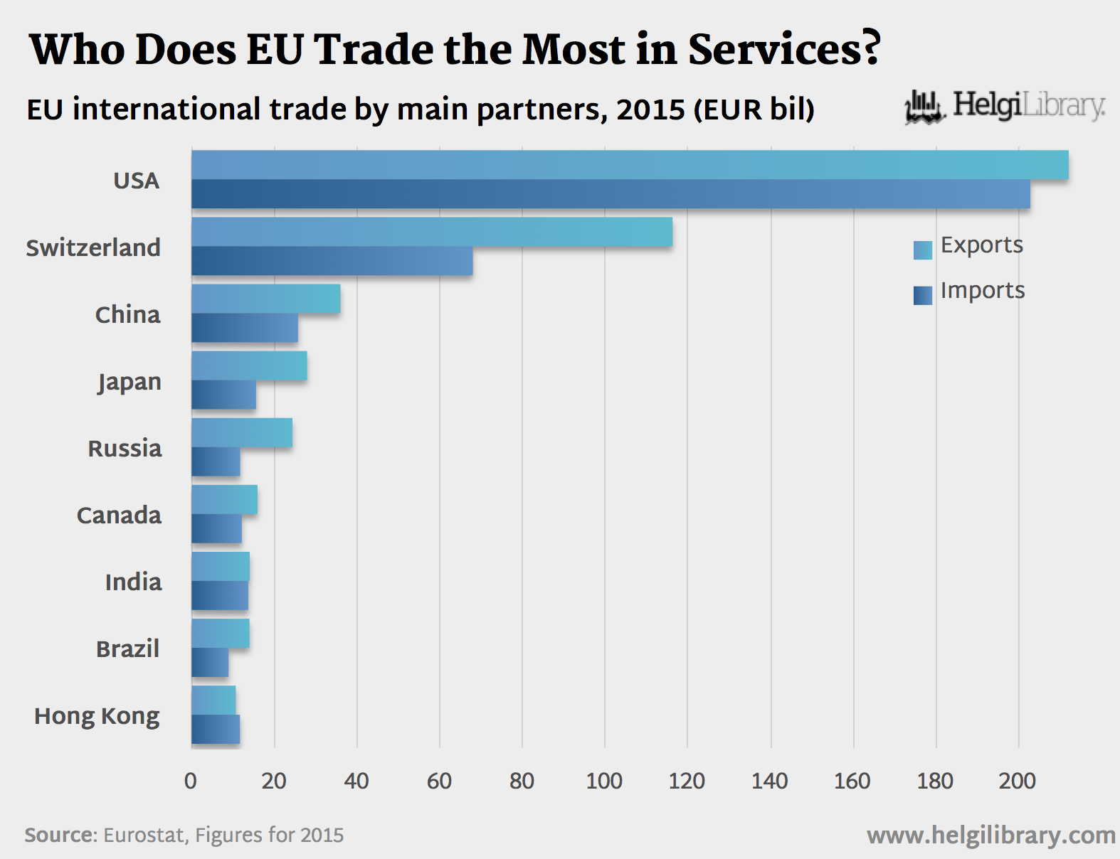 In 2015, the main partners for EU exports of services remained the United States (€212.1 billion, or 26% of extra- EU exports) and Switzerland (€116.3 bn, 14%), well ahead of China (€36.0 bn, 4%), Japan (€27.9 bn, 3%) and Russia (€24.3 bn, 3%).