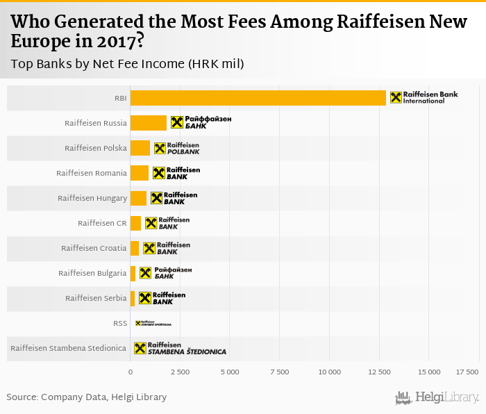 Based on a comparison of 11 banks among Raiffeisen New Europe in 2017, Raiffeisen Bank Int. generated the largest fee income, followed by Raiffeisenbank Russia and Raiffeisen Bank Polska.