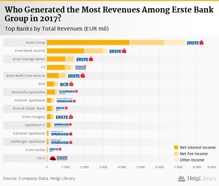 Based on a comparison of 15 banks among Erste Bank Group in 2017, Erste Group Bank generated the largest revenues, followed by Erste Bank Austria and Erste Savings Banks.