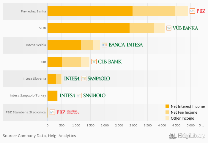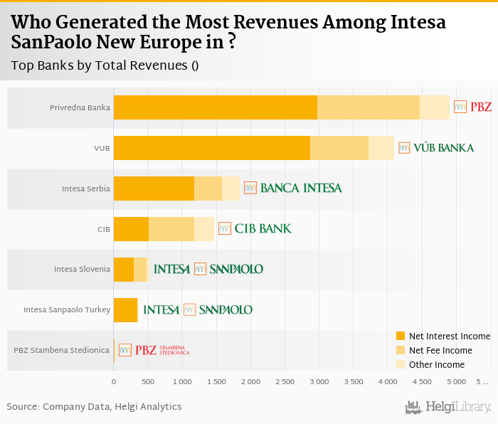 Based on a comparison of 7 banks among Intesa SanPaolo New Europe in 2017, Privredna Banka Zagreb generated the largest revenues, followed by VUB Banka and Bank Intesa Serbia.