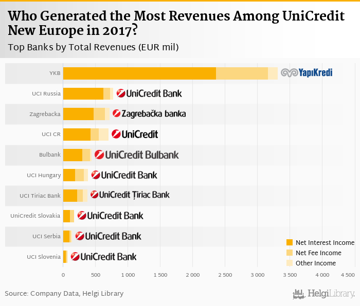 Based on a comparison of 10 banks among UniCredit New Europe in 2017, Yapi Kredi Bank generated the largest revenues, followed by UniCredit Bank Russia and Zagrebacka Banka.