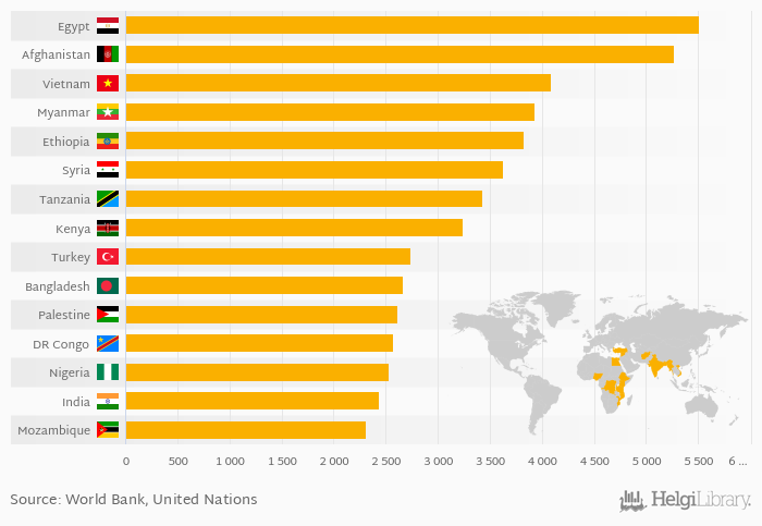 The top ranked country, Egypt, accounted for 3.67 % of development assistance in the world. The top 3 countries hold a 9.90 % share while the ten largest countries some 25.5 % in 2013.