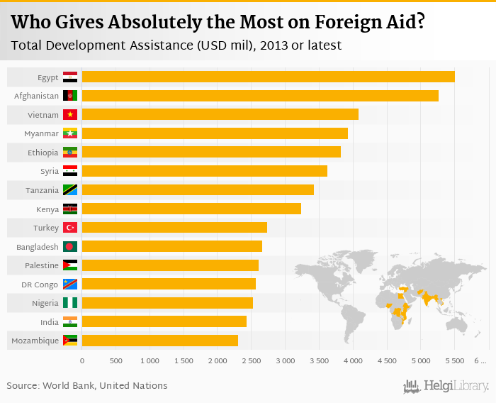 Based on a comparison of 124 countries in 2013, Egypt ranked the highest in development assistance with USD 5,506 mil followed by Afghanistan and Vietnam. On the other end of the scale was China with USD -651 mil, Malaysia with USD -119 mil and Azerbaijan with USD -63.1 mil.