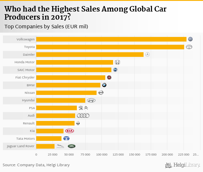 Based on a comparison of 32 firms among Global Car Producers, Volkswagen Group generated the highest sales in 2017 followed by Toyota Motor Corporation and Daimler Group.