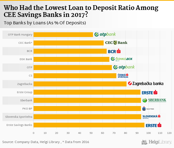 Based on a comparison of 12 banks among CEE Savings Banks in 2017, OTP Bank Hungary operated with the lowest loan to deposit ratio, followed by CEC Bank and Banca Commerciala Romana.