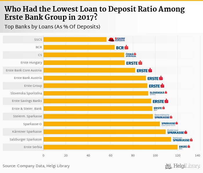 Based on a comparison of 15 banks among Erste Bank Group in 2017, Stavebni Sporitelna Ceske Sporitelny operated with the lowest loan to deposit ratio, followed by Banca Commerciala Romana and Ceska Sporitelna.