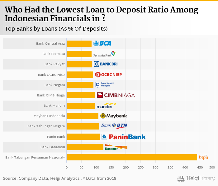Based on a comparison of 12 banks among Indonesian Financials in 2019, Bank Central Asia operated with the lowest loan to deposit ratio, followed by Bank Permata and Bank Rakyat.