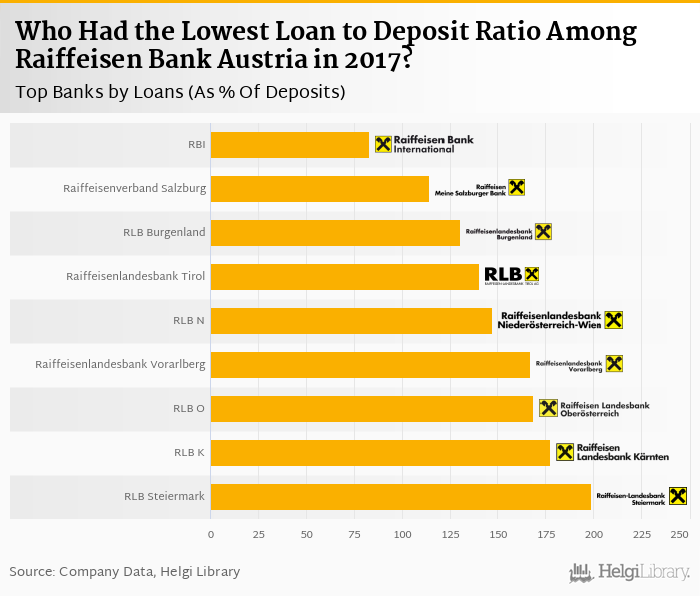 Based on a comparison of 9 banks among Raiffeisen Bank Austria in 2017, Raiffeisen Bank Int. operated with the lowest loan to deposit ratio, followed by Raiffeisenverband Salzburg and Raiffeisenlandesbank Burgenland.